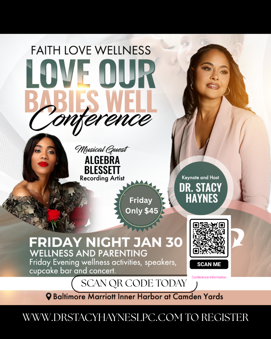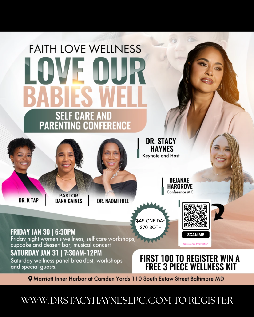 8am- Breakfast Panel Discussion on Women's Financial, Physical and Whole Wellness, Wellness Activities- Vision Boards, Book Signing: Love Our Babies Well New Book by Dr. Stacy Haynes, Presentation to the Baltimore City Mayor's Office- Love Our Babies Well Award, Keynote and Wellness Messages.